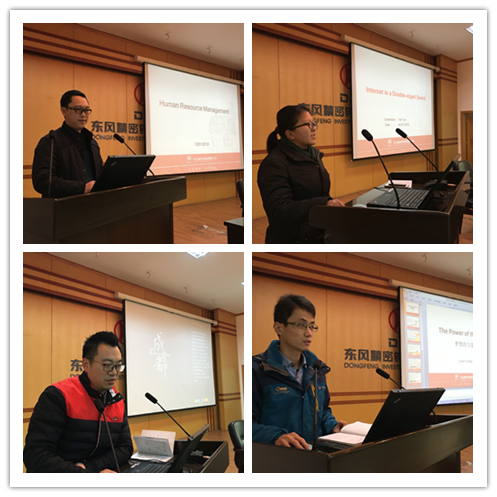 為強化學習效果并學以致用,公司組織英語競賽,分為理論測試與口語演講兩個部分。演講比賽中,聘請汽院專業英語老師為評委,通過個人介紹,主題演講與現場互動問答三個方面,經過激烈的對決,史云、謝勤杰、劉悅三位同志位列前三甲。競賽最后綜合成績待理論考試成績出來后再確定。